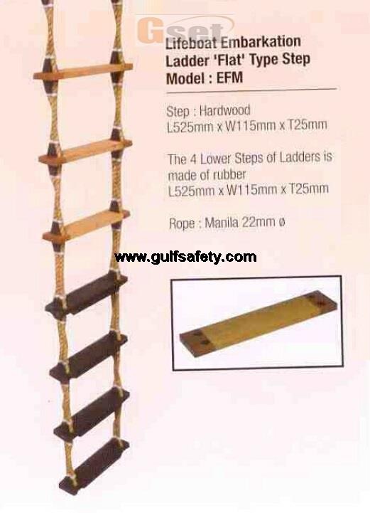 | rope ladder -embarkation ladder (manila rope) with flat wooden steps & rubber steps, step size- 460mm x 100mm x 22mm, side rope- manila 2 x 18 mm, length : 30 mtrs, built to solas specification with local sepecification certificate |